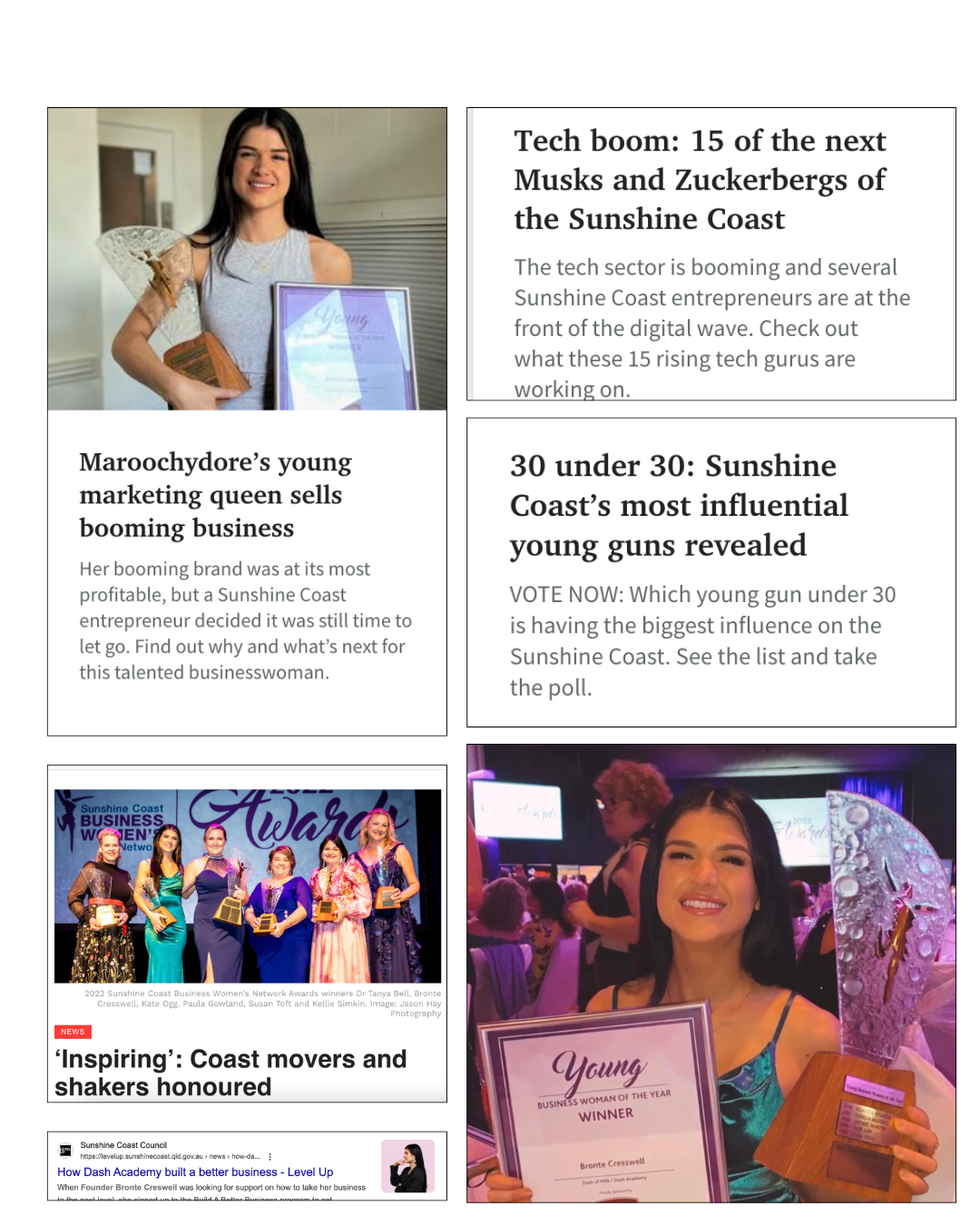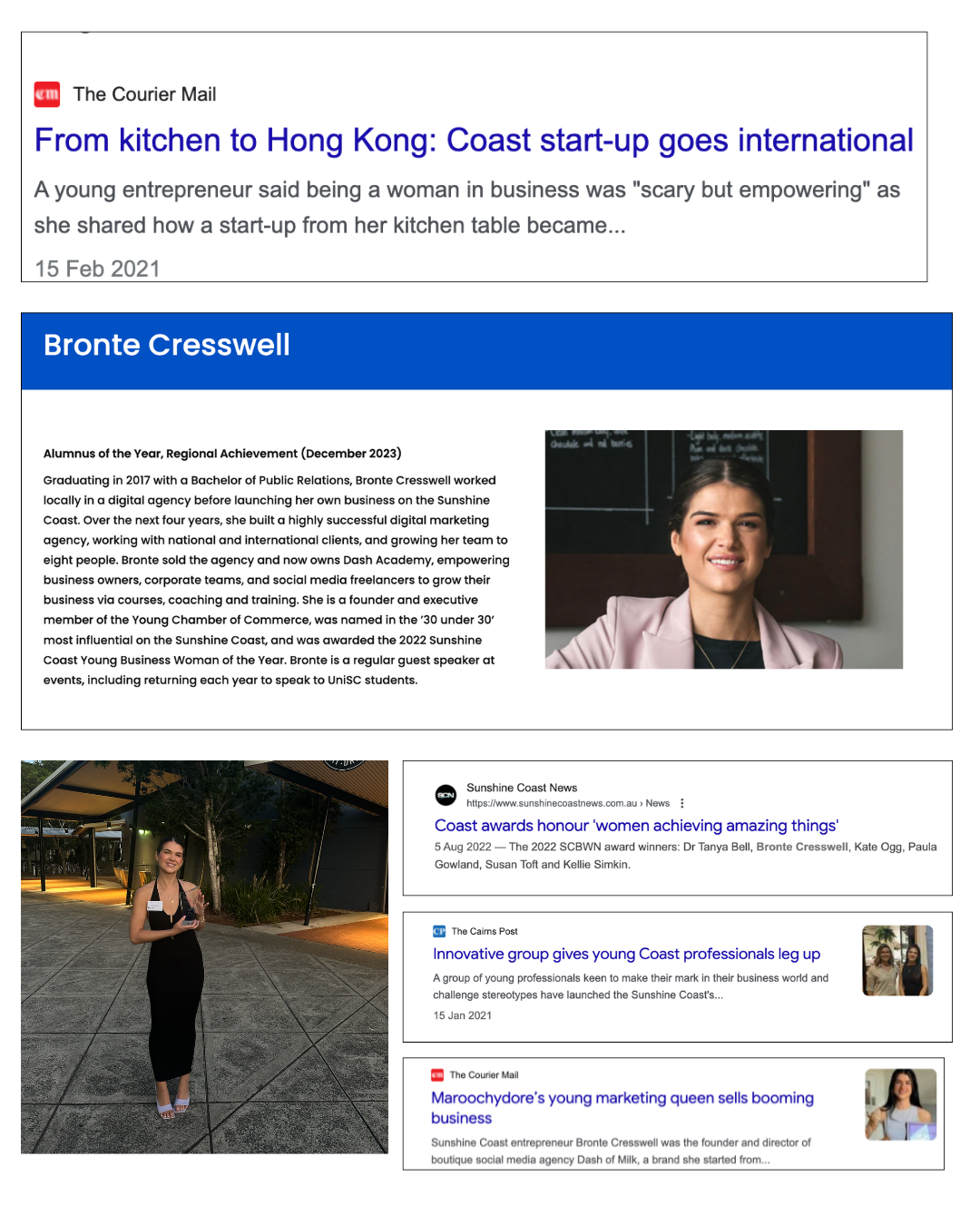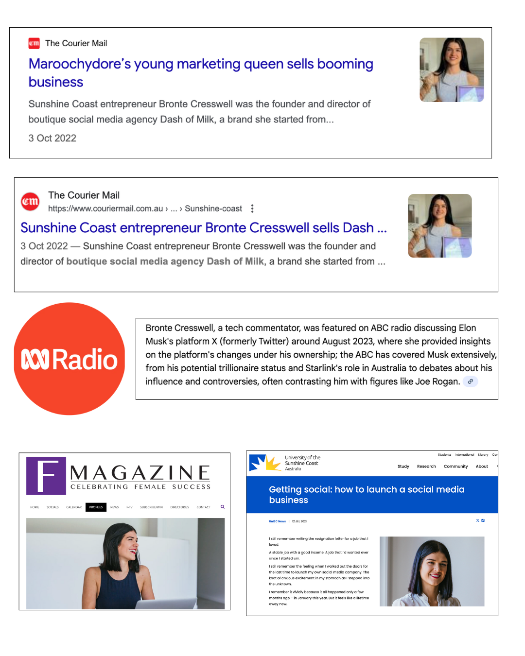 I have featured in the media as a Social Media Expert, Company Founder and Director, Speaker, 2022 Sunshine Coast Young Business Woman of the Year, Named 30 under 30 of the Sunshine Coast and been interviewed by multiple media outlets and podcasts, including a key interview about Elon Musk on ABC radio